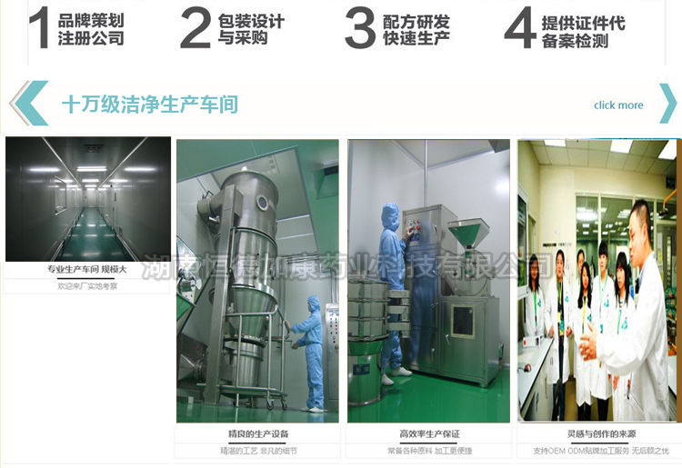 湖南恒德加康科技有限公司是专业从事健康营养食品的自主研发、生产、OEM、ODM服务的生产商,迄今已有10多年的生产经验。严格按照GMP标准运作,通过固体饮料QS、糖果SC认证的现代化生产企业。